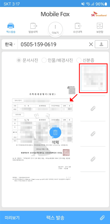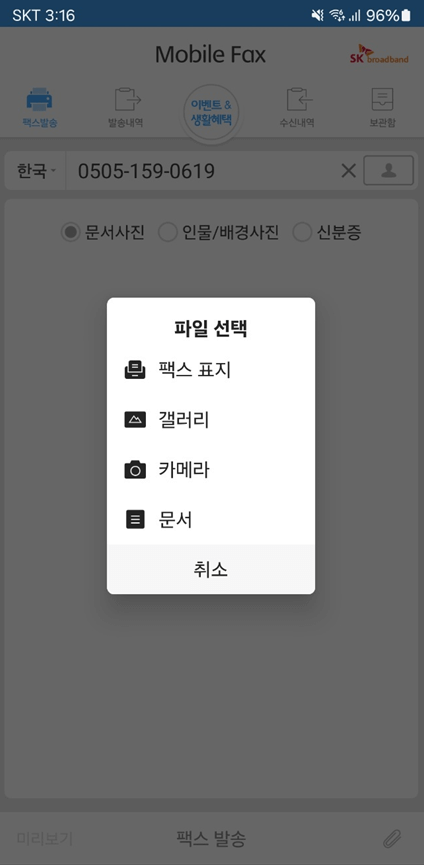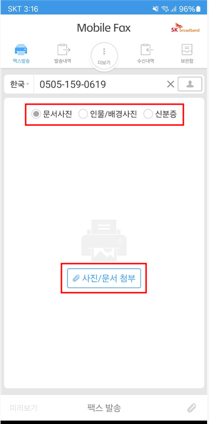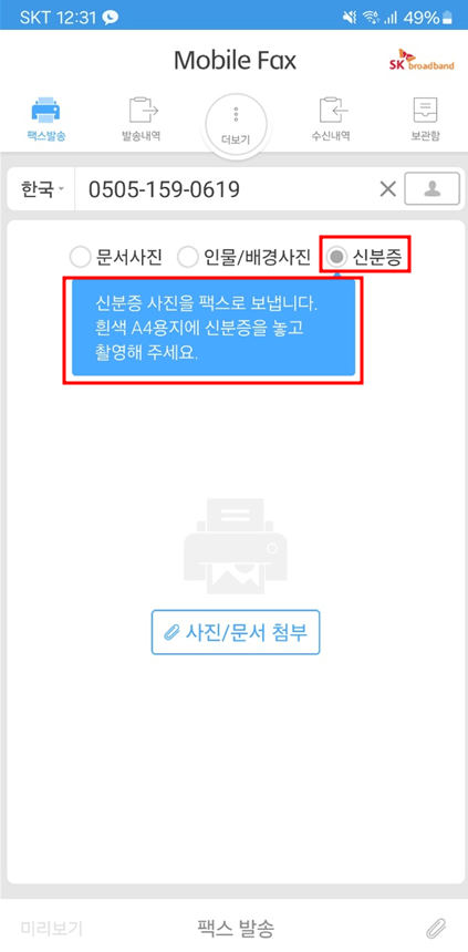 여기서 문서사진, 인물/배경사진, 신분증을 세부적으로 선택하여 팩스를 발송할 수 있도록 구분 지어 놓았으나 그냥 바로 '사진/문서 첨부'란을 눌러서 발송하는 것도 가능합니다.
