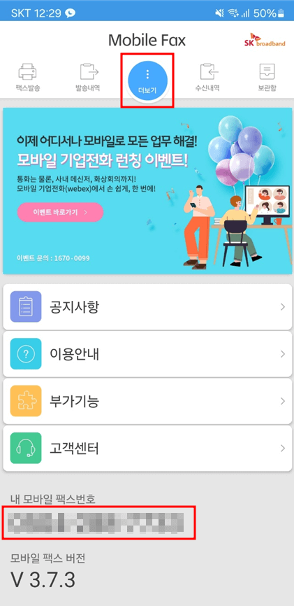 그럼 가운데 있는 '더보기'에 들어가면 맨 하단에서 내 모바일 팩스 번호를 확인할 수 있습니다.