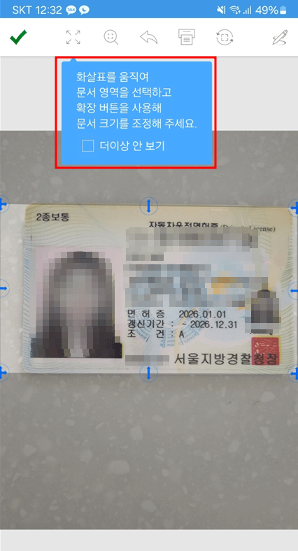 처음부터 신분증 크기에 맞춰서 잘 조정되어 나오는 경우도 있고, 추가 조정이 필요한 경우에는 수동으로 조정하면 됩니다.