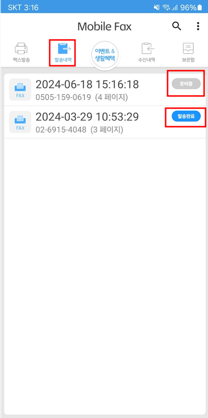 발송 문서들을 다 첨부 후 보낼 상대방의 팩스 번호 입력 후 발송하기를 누르면 발송내역 탭에서 '준비중', '발송중', '발송완료' 등의 상태를 확인할 수 있습니다.