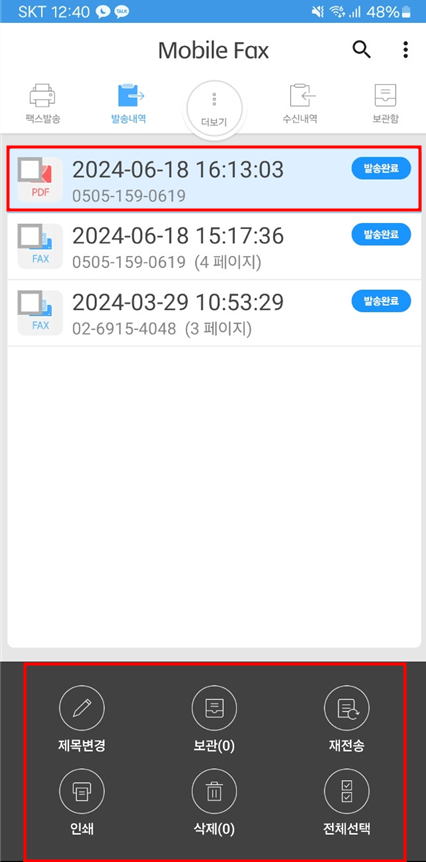 팩스를 수신, 발신한 내용을 인쇄하거나 재전송하는 등의 추가 작업이 필요하면 해당 파일을 누른 뒤 맨 위의 오른쪽에 있는 점 세 개 표시를 누르면 여러 추가 이용 가능한 기능들이 나옵니다.