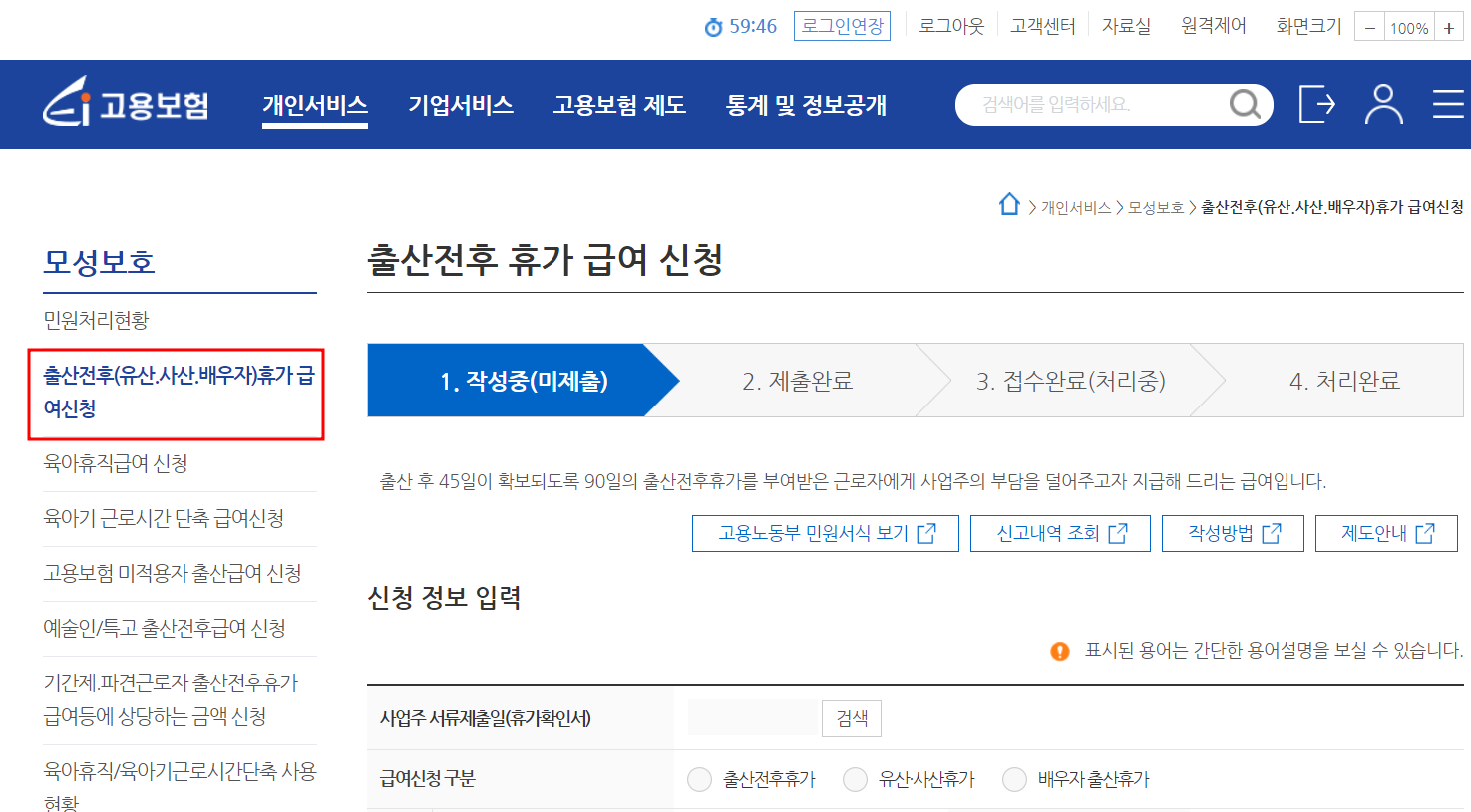 먼저 고용보험 홈페이지에 접속하여 '출산전후(유산, 사산, 배우자) 휴가 급여신청'란에 들어갑니다.